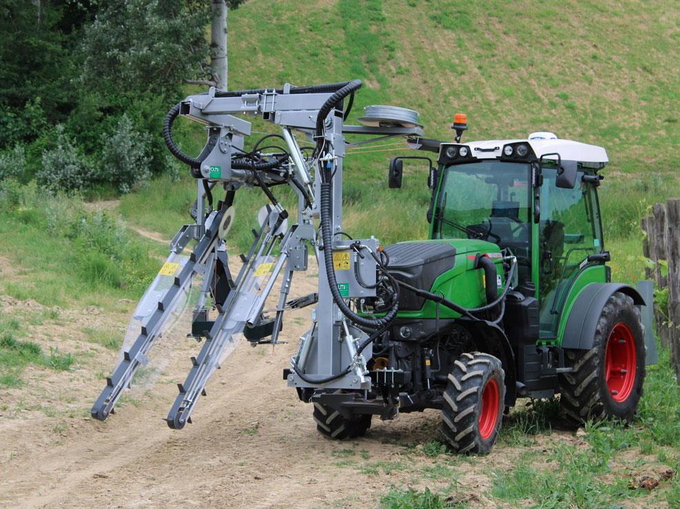 Legatrice per vigneti con telaio anteriore montato sul trattore GOMMATO, telaio con legatore anteriore e movimenti elettro-idraulici con joystick.