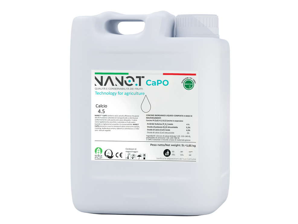 NANO.T ® CaPO contiene calcio ad alta efficienza che grazie alla formulazione colloidale di nanoparticelle si distribuisce uniformemente sulla pianta ed è poco dilavabile. Il calcio viene rapidamente assorbito e veicolato ai frutti contribuendo a migliorarne la qualità e la conservabilità.